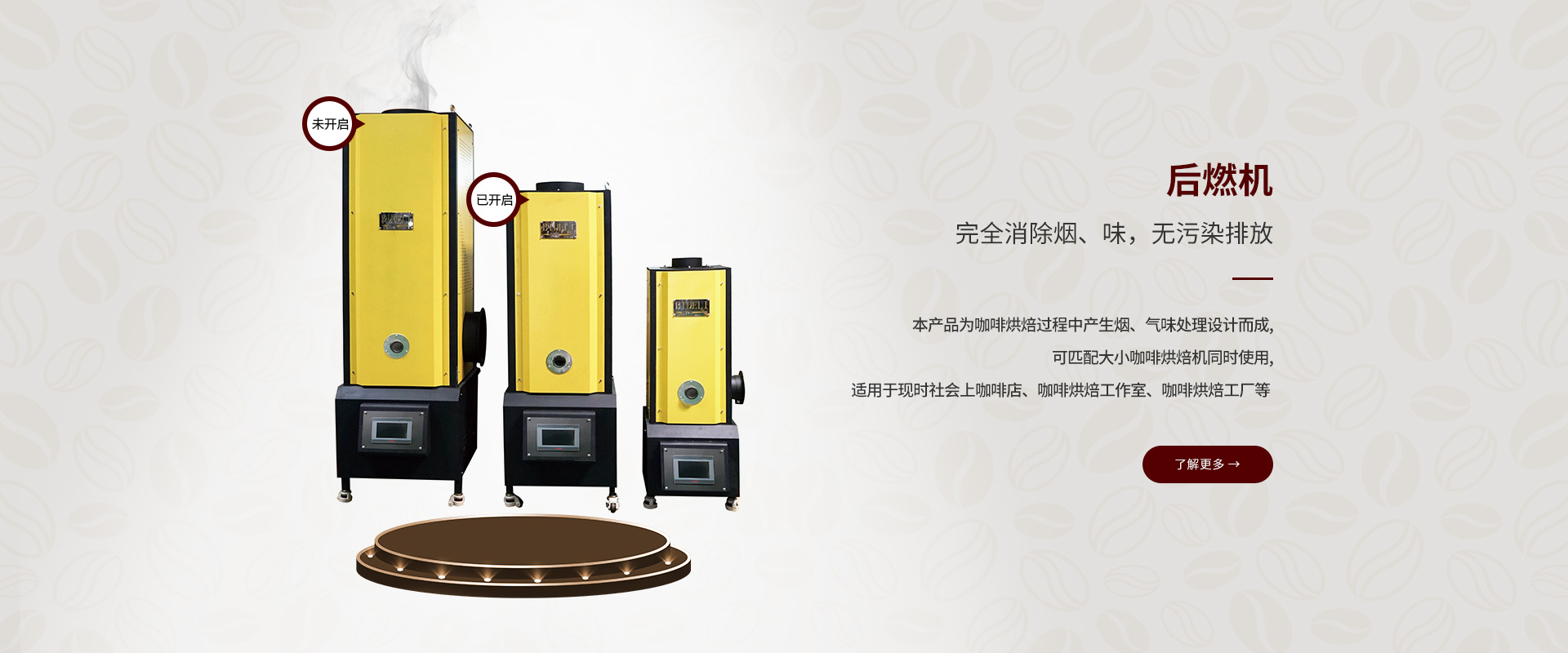 公司有三大系列的產品:咖啡烘焙機成套設備;開心果、花生、瓜子等農副產品烘烤設備;米排粉自動化生產線。